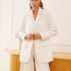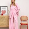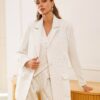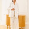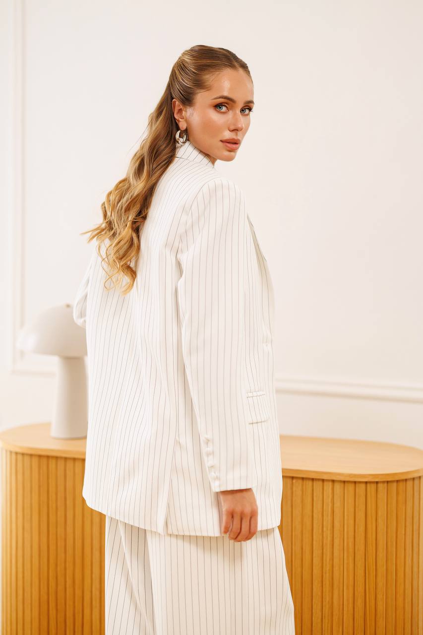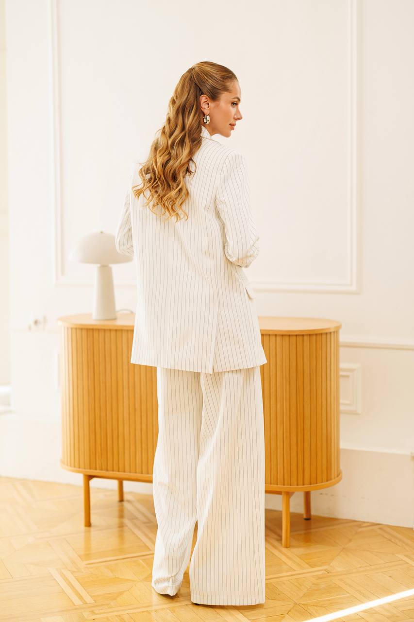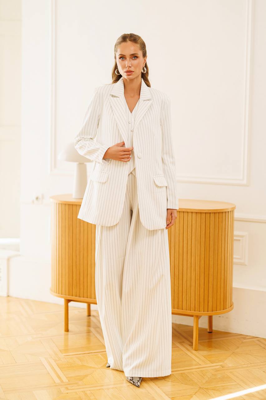 Ten elegancki, trzyczęściowy zestaw to doskonały wybór dla osób ceniących sobie styl i komfort. W skład zestawu wchodzi klasyczna, dłuższa marynarka w delikatne paski, która dodaje szyku każdej stylizacji. Pod marynarką znajduje się minimalistyczna kamizelka, idealna do noszenia zarówno samodzielnie, jak i w połączeniu z innymi elementami garderoby. Całość dopełniają szerokie spodnie, które zapewniają swobodę ruchów oraz nowoczesny wygląd. Zestaw ten sprawdzi się doskonale zarówno na formalnych spotkaniach, jak i w codziennych stylizacjach, oferując wszechstronność i elegancję.