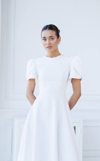 VIKTORIA Sukienka Rozkloszowana Midi 500 z Bufiastym Rękawem Ecru