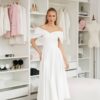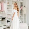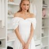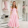Sukienka emanuje świeżością i lekkością. Fason jest elegancki, z rozkloszowaną spódnicą, która pięknie podkreśla ruchy, a górna część sukienki ma efektowny, sercowy dekolt i szerokie, drapowane rękawy, które nadają całości romantyczny charakter. Sukienka doskonale eksponuje ramiona, co dodaje jej kobiecości. Długość midi sprawia, że jest uniwersalna i idealna na różne okazje, od wesel po letnie przyjęcia. Dodatkowo, całość świetnie komponuje się z delikatnymi, eleganckimi dodatkami, takimi jak szpilki czy biżuteria. Sukienka ta z pewnością przyciągnie wzrok i sprawi, że każda kobieta poczuje się w niej wyjątkowo.