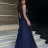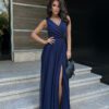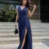 Piękna długa sukienka , niezwykle zgrabna, uszyta ze zwiewnej tkaniny. Góra z delikatnym dekoltem, dół dwuwarstwowy z wycięciem na nodze, dodającym kreacji powabności. Do sukienki dołączony pasek. Dostępna w modnych kolorach.