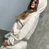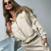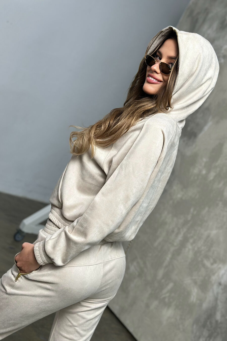 Opis produktu: Komplet zamszowy BG NEW ESSENTIAL w kolorze beżowym. Rozpinana bluza z kapturem ozdobiona złotym haftem BG na piersi oraz złotym haftem z logo marki na kapturze. Złoty, metalowy suwak wszyty również na kapturze dookoła głowy. Spodnie posiadają gumkę w pasie oraz złote, metalowe suwaki w kieszeniach. Na środku paska w spodniach haftowane logo marki BG. Spodnie oraz bluza posiadają ozdobne przeszycia. Spodnie modelujące sylwetkę.