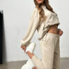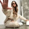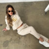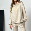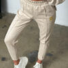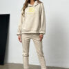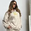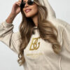 Opis produktu: Komplet zamszowy BG ROYAL SUEDE w kolorze beżowym. Bluza kangurka z kapturem ozdobiona dużym haftowanym złotym logiem marki BG BRANDENBURG COUTURE. Spodnie posiadają gumkę w pasie. Na lewej kieszeni spodni wyhaftowane złote logo marki. Krój oversize. Ozdobne przeszycia na bluzie oraz spodniach. Modelka ma na sobie rozmiar S.