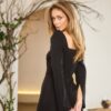 Przedstawiamy elegancką sukienkę, która wyróżnia się nowoczesnym designem i klasyczną kolorystyką. Górna część ma prosty, kwadratowy dekolt oraz długie, lekko bufiaste rękawy, które dodają całości subtelnej elegancji. Kolor głębokiej czerni sprawia, że sukienka jest uniwersalna i ponadczasowa, idealna na różnorodne okazje. Fason podkreśla sylwetkę, a jednocześnie oferuje komfort noszenia. Ta sukienka to doskonały wybór dla kobiet, które pragną łączyć styl z wygodą, zachwycając w każdej sytuacji.