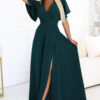 Sukienka ma elegancki, długotrwały krój z asymetrycznym dekoltem, który odsłania jedno ramię. Wykonana z błyszczącego materiału. Z przodu znajduje się wysoki rozcięcie, które dodaje drapieżności, a jednocześnie eksponuje nogi. W talii sukienka jest lekko drapowana, co podkreśla sylwetkę. Całość dopełniają eleganckie sandały na obcasie, które idealnie harmonizują z całością stylizacji.