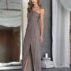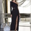 Sukienka ma elegancki, długotrwały krój z asymetrycznym dekoltem, który odsłania jedno ramię. Wykonana z błyszczącego materiału. Z przodu znajduje się wysoki rozcięcie, które dodaje drapieżności, a jednocześnie eksponuje nogi. W talii sukienka jest lekko drapowana, co podkreśla sylwetkę. Całość dopełniają eleganckie sandały na obcasie, które idealnie harmonizują z całością stylizacji.