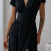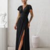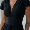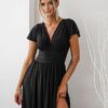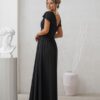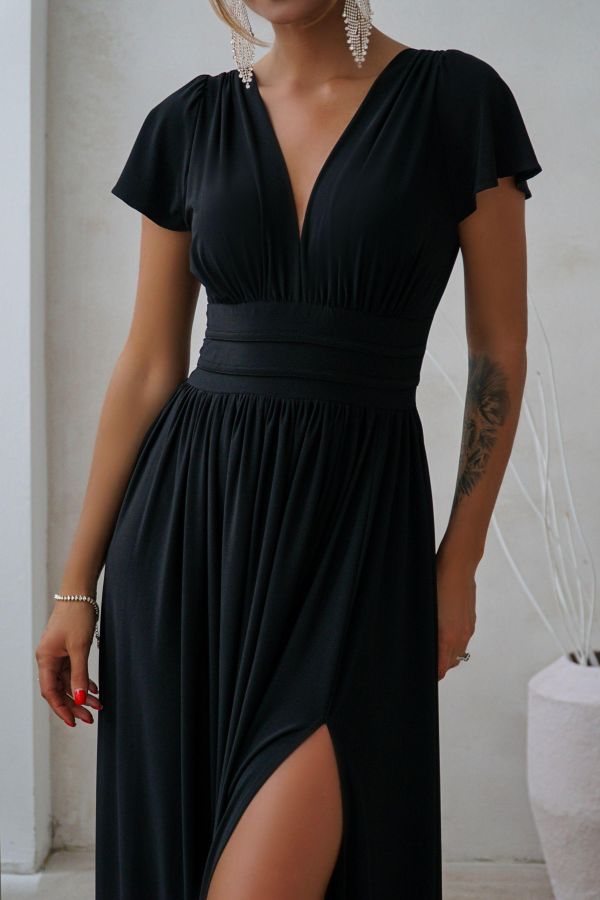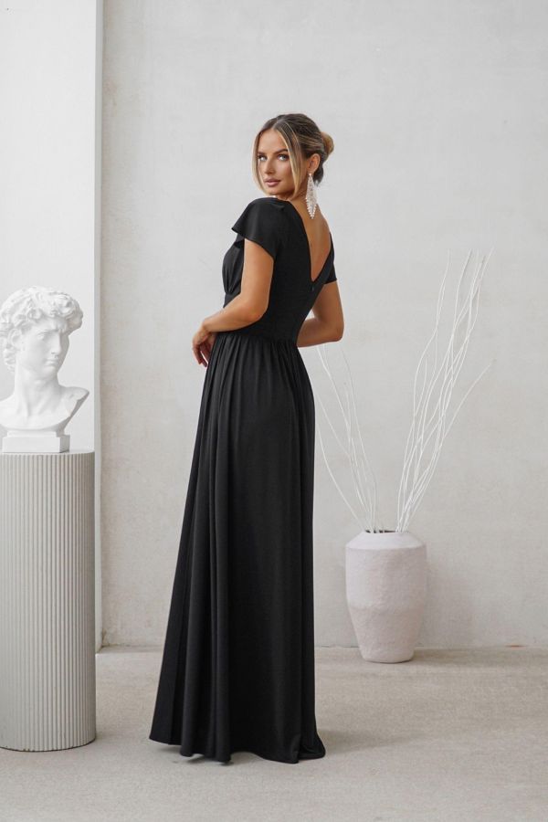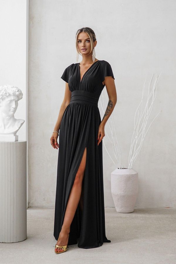 Elegancka suknia maxi z dekoltem w kształcie litery V uszyta w ten sposób, aby jego wielkość można było samodzielnie regulować. Lśnij jak gwiazda.