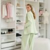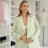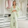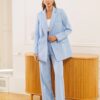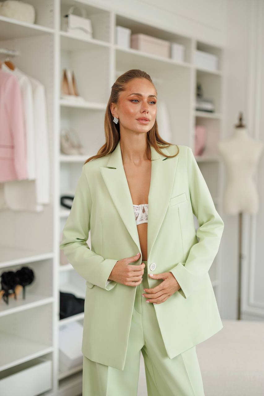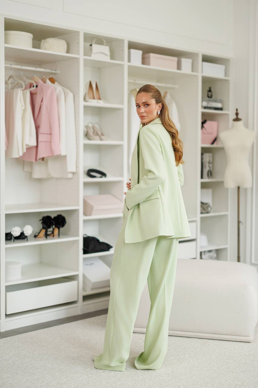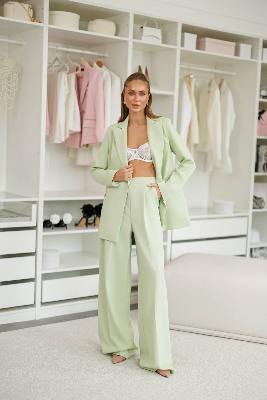 Komplet składa się z oversize’owej marynarki oraz szerokich spodni. Marynarka ma klasyczny krój, co nadaje elegancki charakter, a jej luźny fason sprawia, że jest wygodna i modna. Spodnie, również o szerokim kroju, świetnie komponują się z górą, tworząc harmonijną całość. Idealny wybór na wiele okazji, od spotkań biznesowych po wieczorne wyjścia. Komplet można zestawić z minimalistycznymi dodatkami, aby podkreślić jego nowoczesny styl.