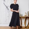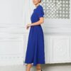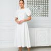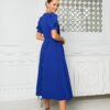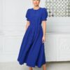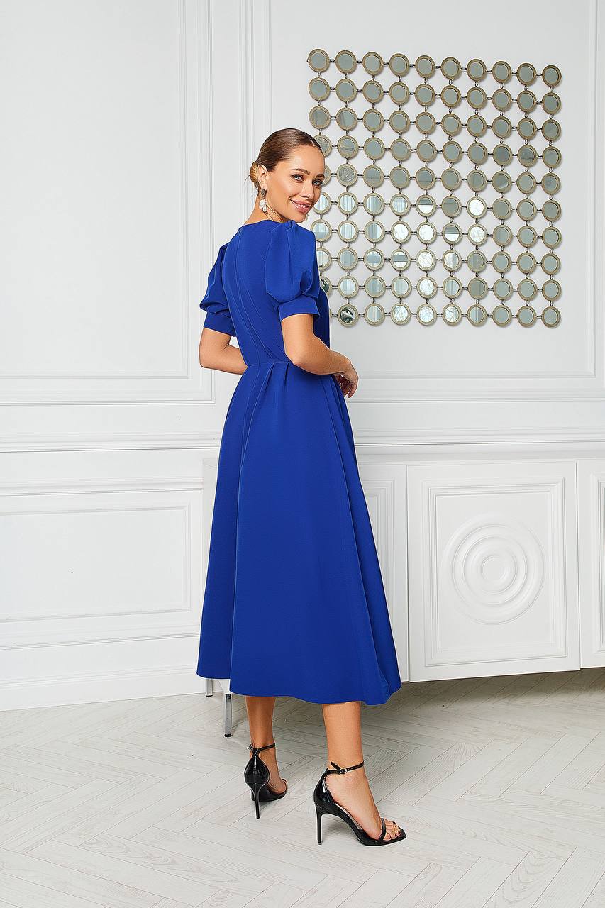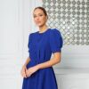 Sukienka której fason jest klasyczny, z długością sięgającą za kolano, co sprawia, że jest elegancka i odpowiednia na różne okazje. Rękawy są lekko bufiaste, dodając całości romantycznego charakteru. Zapięcie na guziki z przodu nadaje sukience uroku i sprawia, że wygląda na wygodną do noszenia. Dodatkowo, sukienka ma subtelne plisy, które podkreślają talię, a lekki materiał z pewnością zapewnia komfort. Stylizację dopełniają eleganckie sandały na obcasie, które nadają całości szyku.