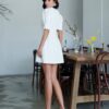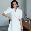 Sukienka Luxe to wyrafinowana propozycja dla kobiet ceniących elegancję z nutą nowoczesności. Inspirowana klasycznym krojem marynarki, łączy w sobie szykowny formalizm i kobiecą zmysłowość. Jej minimalistyczna forma z mocno zaznaczoną linią ramion i talii nadaje sylwetce charakterystyczny, silny wyraz. Długi, szalowy kołnierz, dwurzędowe zapięcie oraz krótkie, bufiaste rękawy nadają całości luksusowego, ale bardzo współczesnego wyglądu. Długość mini sprawia, że kreacja prezentuje się lekko i nowocześnie – idealna zarówno na eleganckie kolacje, jak i ważne spotkania biznesowe.