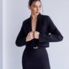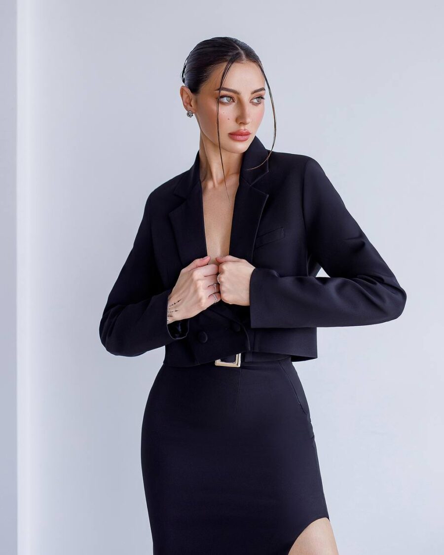 Komplet składający się z eleganckiej marynarki i dopasowanej spódnicy to idealna propozycja dla kobiet, które pragną łączyć klasykę z nowoczesnością. Marynarka ma podwójne zapięcie na guziki oraz szerokie klapy, co nadaje jej wyrafinowanego charakteru. Spódnica o długości midi, również w tym samym kolorze, ma wysokie rozcięcie z boku, które eksponuje nogi i dodaje całości zmysłowości. Fason podkreśla kobiecą sylwetkę, a gładki materiał sprawia, że komplet jest nie tylko stylowy, ale także wygodny. Idealny wybór na formalne okazje, spotkania biznesowe czy wieczorne wyjścia, ten zestaw z pewnością przyciągnie uwagę i zapewni elegancki wygląd.