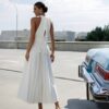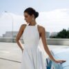 Rozkloszowana sukienka midi bez rękawów z wiązaniem na plecach.
