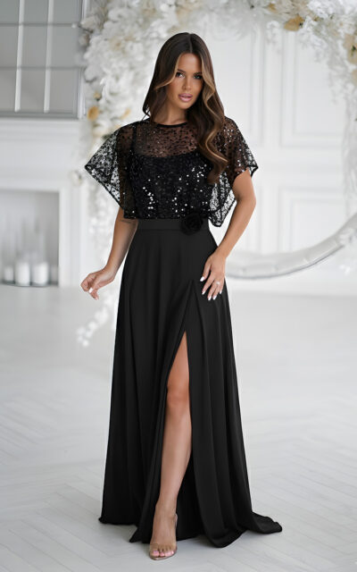Sukienka na Ramiączkach z Cekinowym Bolerkiem Maxi 333-06 Czarny