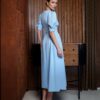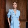 Elegancka sukienka, kreacja o rozkloszowanym kroju midi. Posiada krótkie, bufiaste rękawy, które nadają jej romantycznego i kobiecego charakteru. Dekolt jest kopertowy, co subtelnie podkreśla sylwetkę. Sukienka ma dopasowaną górę i luźniejszy dół, dzięki czemu wygląda lekko i zwiewnie. Stylizacja została uzupełniona czarnymi butami na obcasie z ozdobnymi kokardkami, które dodają elegancji i kontrastu do całości.