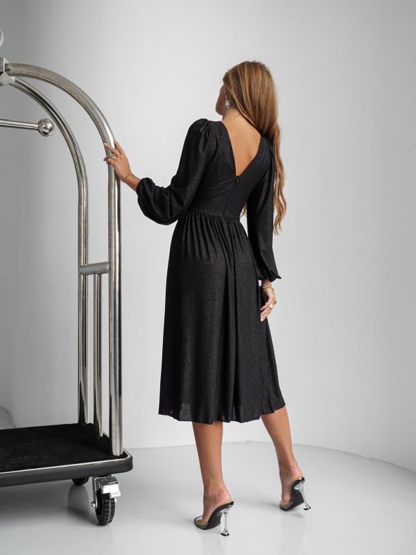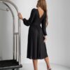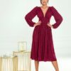 Elegancka suknia midi z dekoltem w kształcie litery V uszyta w ten sposób, aby jego wielkość można było samodzielnie regulować. Pokochasz ten fason.
