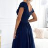 Matilde – rozkloszowana sukienka z kopertowym dekoltem i krótkim rękawkiem. Uszyta z elastycznego połyskującego materiału w kolorze granatowym. Produkt polski.