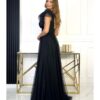 Suknia Maxi, tiulowa z falbanami na ramionach.