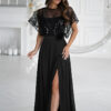 Elegancka sukienka na cienkich ramiączkach, wykonana z lekkiego materiału, uzupełniona połyskującym cekinowym bolerkiem z różą na pasku. Błyszczące wykończenie dodaje stylizacji szyku i blasku, czyniąc ją idealnym wyborem na wieczorne wyjścia i wyjątkowe okazje.