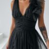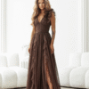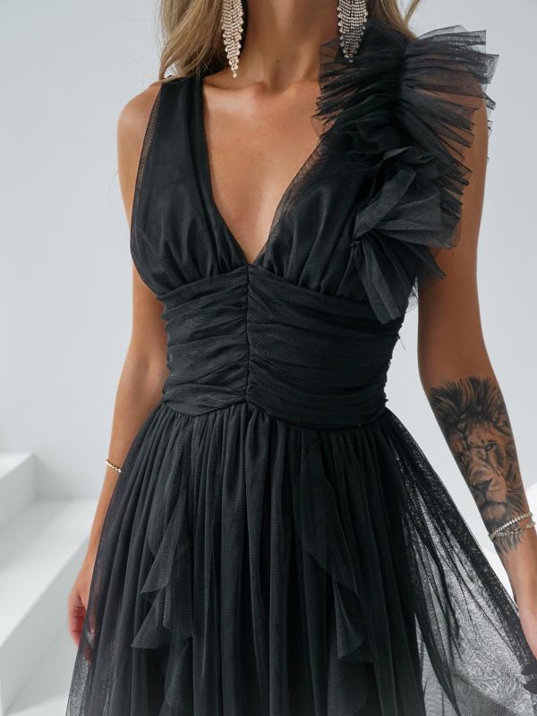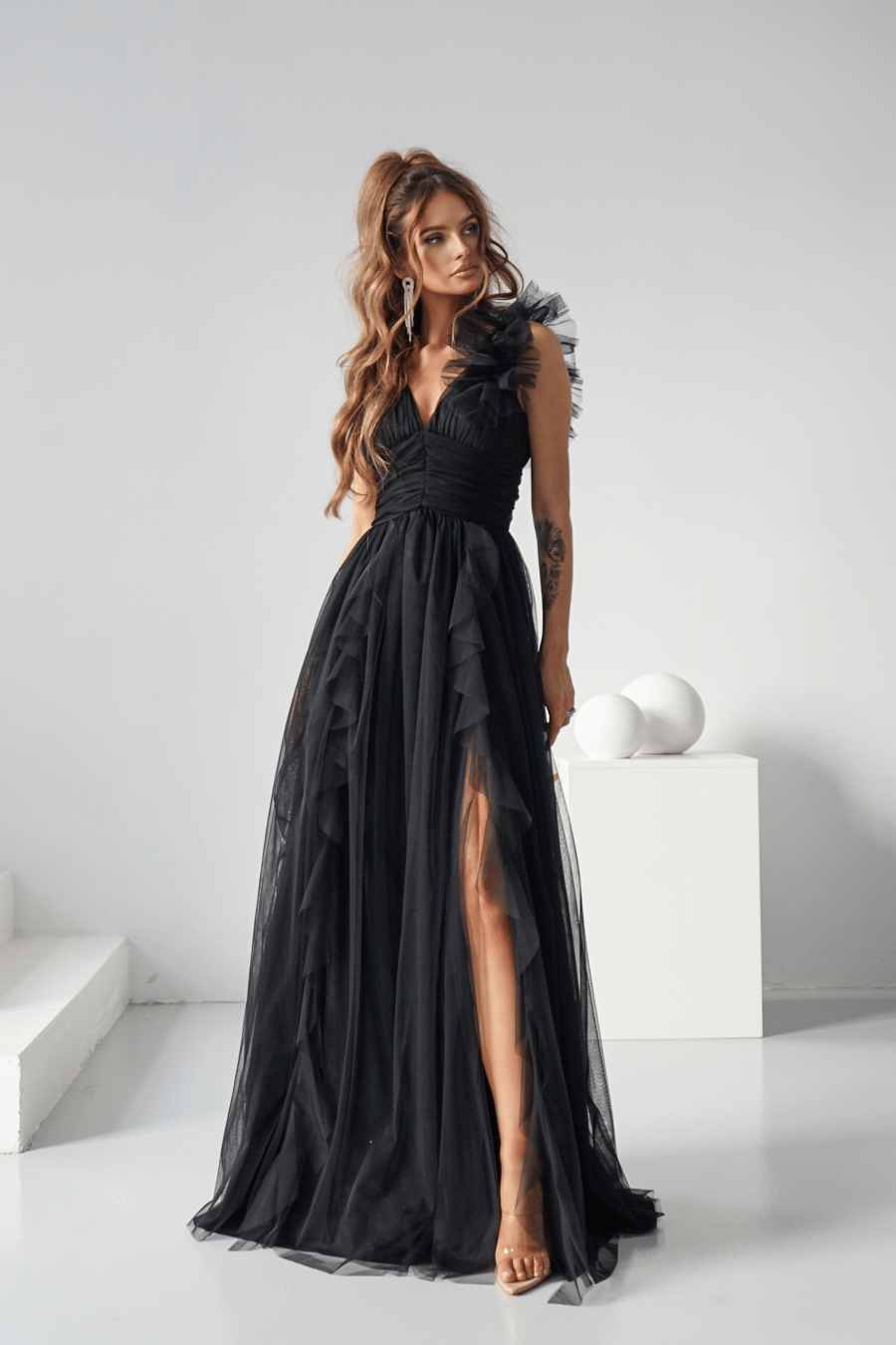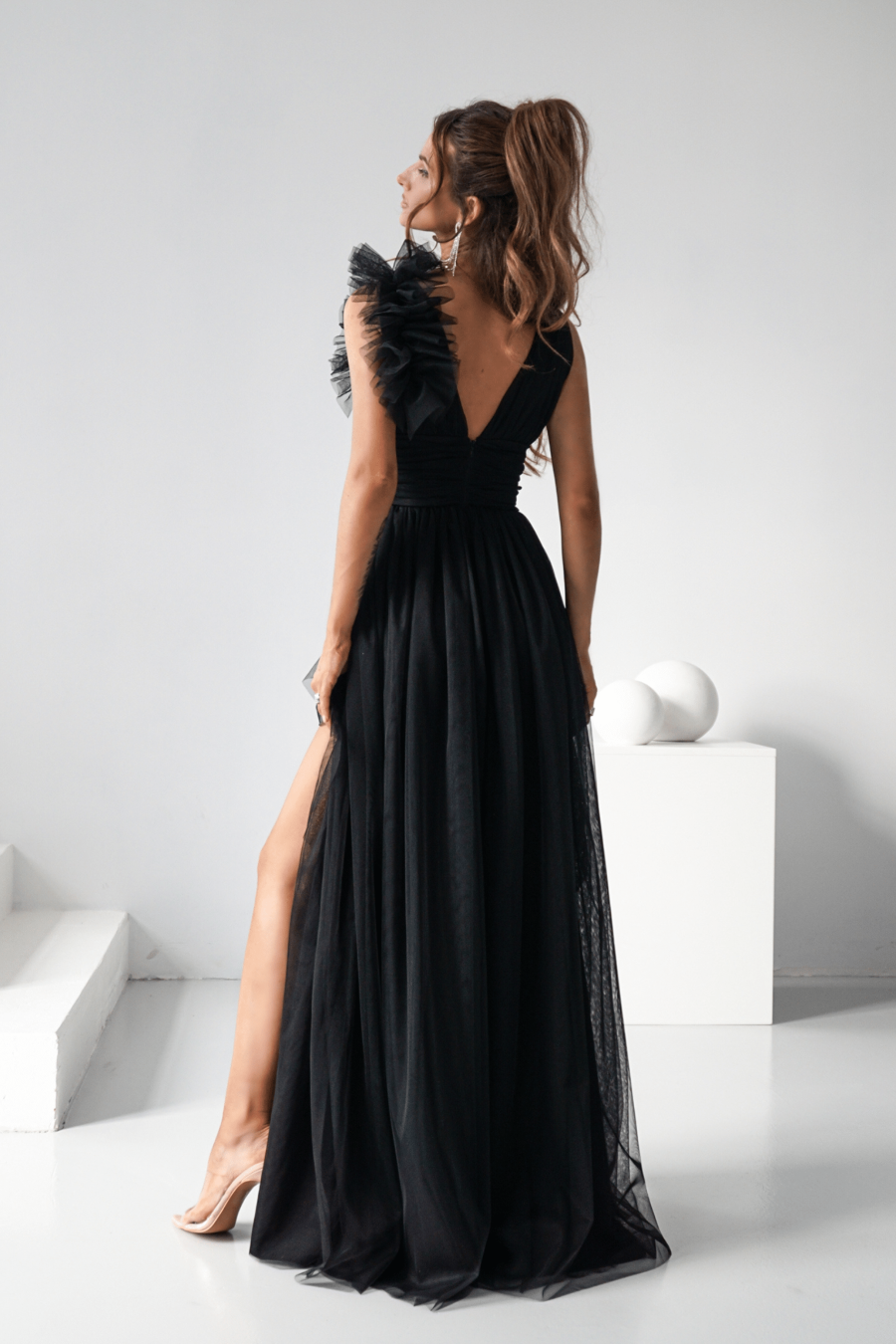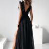 Sukienka ma długość maxi i jest wykonana z lekkiego, zwiewnego materiału, co nadaje jej elegancki i romantyczny charakter. Górna część jest dopasowana, z dekoltem w kształcie litery V, co podkreśla sylwetkę. Na jednym ramieniu znajduje się ozdobny detal w postaci falbanek, dodający całości subtelnego uroku. Dół sukienki jest lekko rozkloszowany, a na bokach znajdują się głębokie rozcięcia. Całość jest wykończona w sposób, który podkreśla kobiecość i elegancję, czyniąc sukienkę idealną na specjalne okazje.