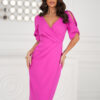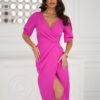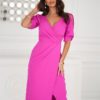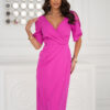 Stylowa i kobieca sukienka o dopasowanym kroju, idealna na eleganckie okazje. Kopertowy dekolt subtelnie eksponuje biust, a rękawy z rozcięciem dodają lekkości i oryginalności. Asymetryczne marszczenia wysmuklają sylwetkę, a rozporek z przodu podkreśla nogi i zapewnia wygodę. Perfekcyjny wybór na wesela, randki i oficjalne spotkania!