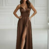 Sukienka o balowym charakterze, wykonana z połyskującej satyny. Szeroki, elegancko układający się dół nadaje jej luksusowego wyglądu, a ukryte w spódnicy kieszenie dodają praktyczności. Zmysłowe gorsetowe sznurowanie na plecach pięknie podkreśla talię. Idealna na studniówkę, wesele i inne wyjątkowe okazje.