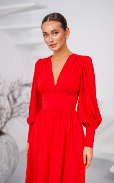 STELLA Sukienka Rozkloszowana Midi 352/1 z Bufiastym Rękawem Czerwony