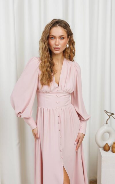 MARIA Sukienka Maxi 333 z Bufiastymi Rękawami Pudrowy Róż