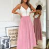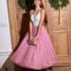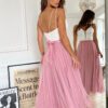 Niezwykle dziewczęcy model sukienki uszyty ze ślicznej koronki. Sukienka na cieniutkich ramiączkach, z dekoltem w serek, wykończonym minimalistyczną siateczką. Dół warstwowy, rozkloszowany, przepasany paseczkiem z kokardką ze spódnicą o długości 7/8. Model dostępny w pięknej gamie kolorystycznej.