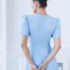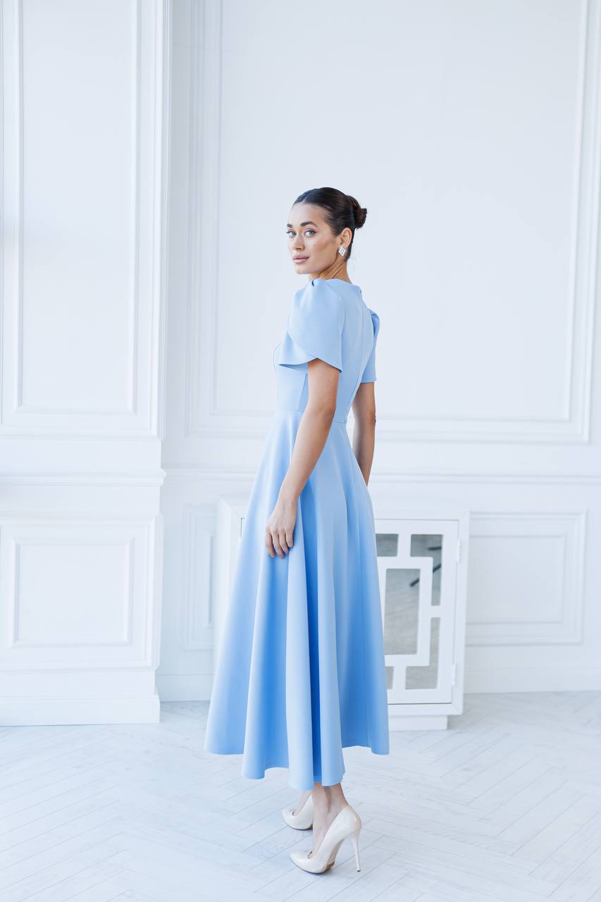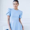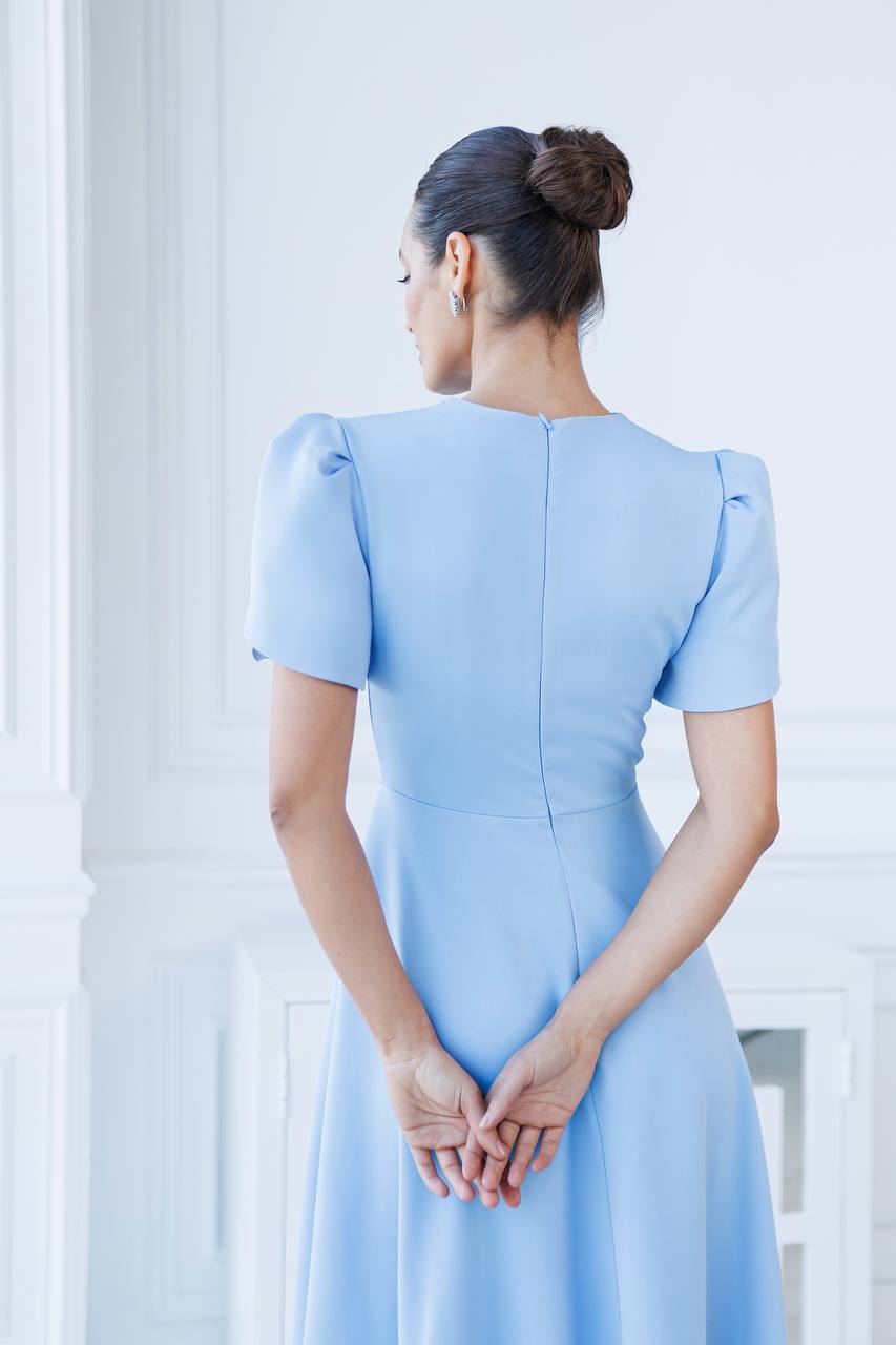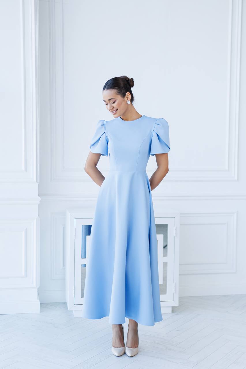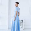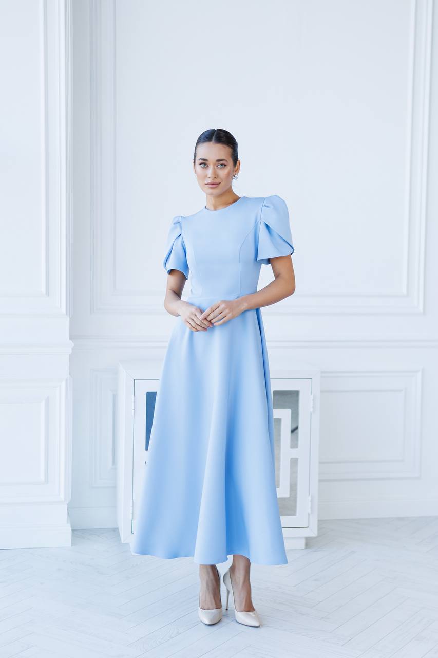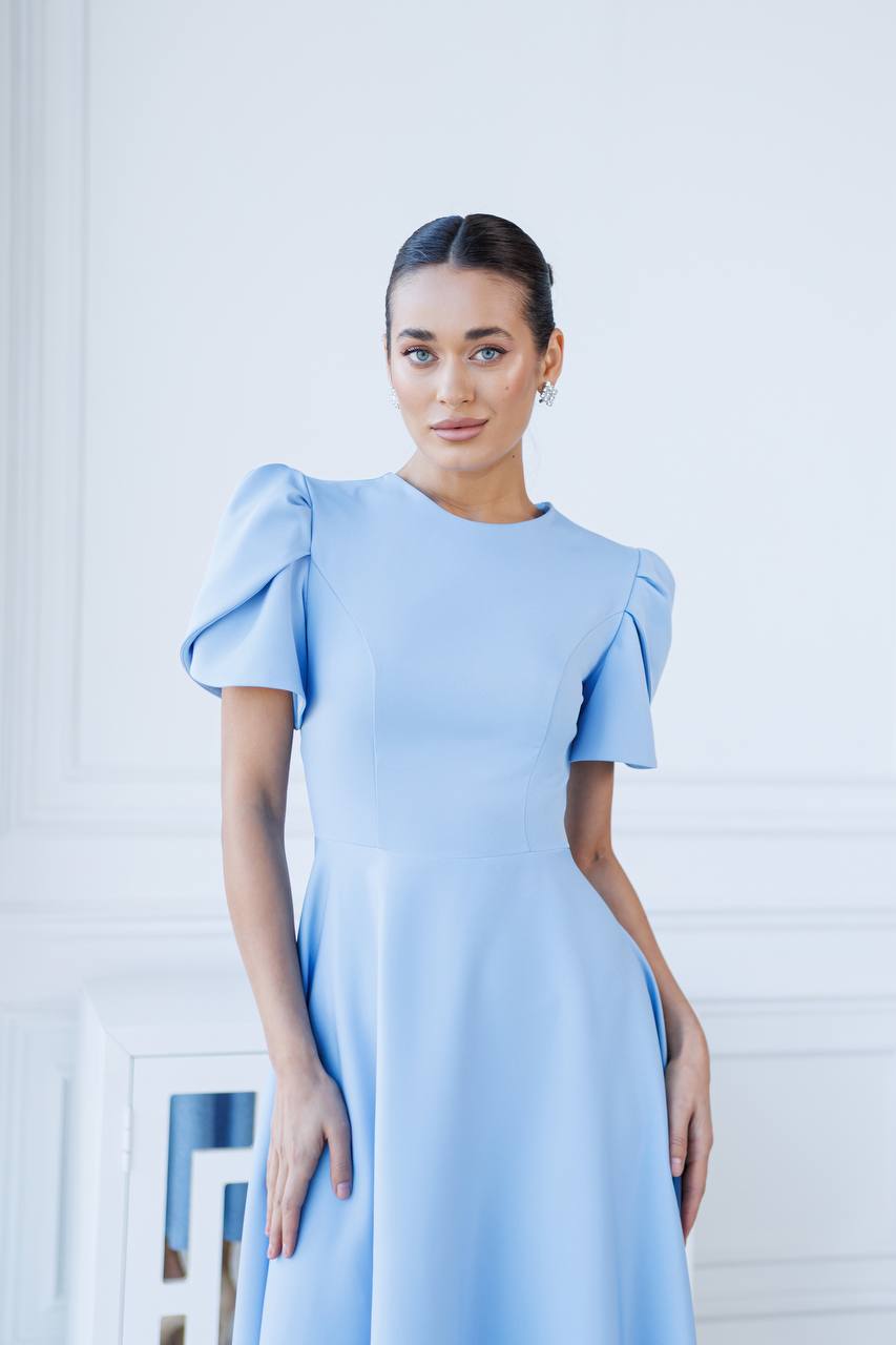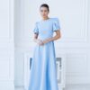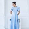 Sukienka nadaje jej świeżości i lekkości. Fason jest elegancki, z długą, swobodnie opadającą spódnicą, co sprawia, że jest idealna na różne okazje. Rękawy są zjawiskowe, z bufkami, co dodaje sukience romantycznego i stylowego wyglądu. Góra sukienki ma prosty, okrągły dekolt, co podkreśla elegancję całości. Materiał wydaje się być gładki i przyjemny w dotyku, co podnosi komfort noszenia. Sukienka ta może być doskonałym wyborem na przyjęcia, wesela czy inne wyjątkowe wydarzenia, gdzie chcesz wyglądać stylowo i kobieco. Dodatki w postaci eleganckich butów i biżuterii będą świetnie dopełniać ten look.