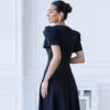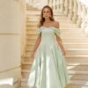 Sukienka nadaje jej świeżości i lekkości. Fason jest elegancki, z długą, swobodnie opadającą spódnicą, co sprawia, że jest idealna na różne okazje. Rękawy są zjawiskowe, z bufkami, co dodaje sukience romantycznego i stylowego wyglądu. Góra sukienki ma prosty, okrągły dekolt, co podkreśla elegancję całości. Materiał wydaje się być gładki i przyjemny w dotyku, co podnosi komfort noszenia. Sukienka ta może być doskonałym wyborem na przyjęcia, wesela czy inne wyjątkowe wydarzenia, gdzie chcesz wyglądać stylowo i kobieco. Dodatki w postaci eleganckich butów i biżuterii będą świetnie dopełniać ten look.