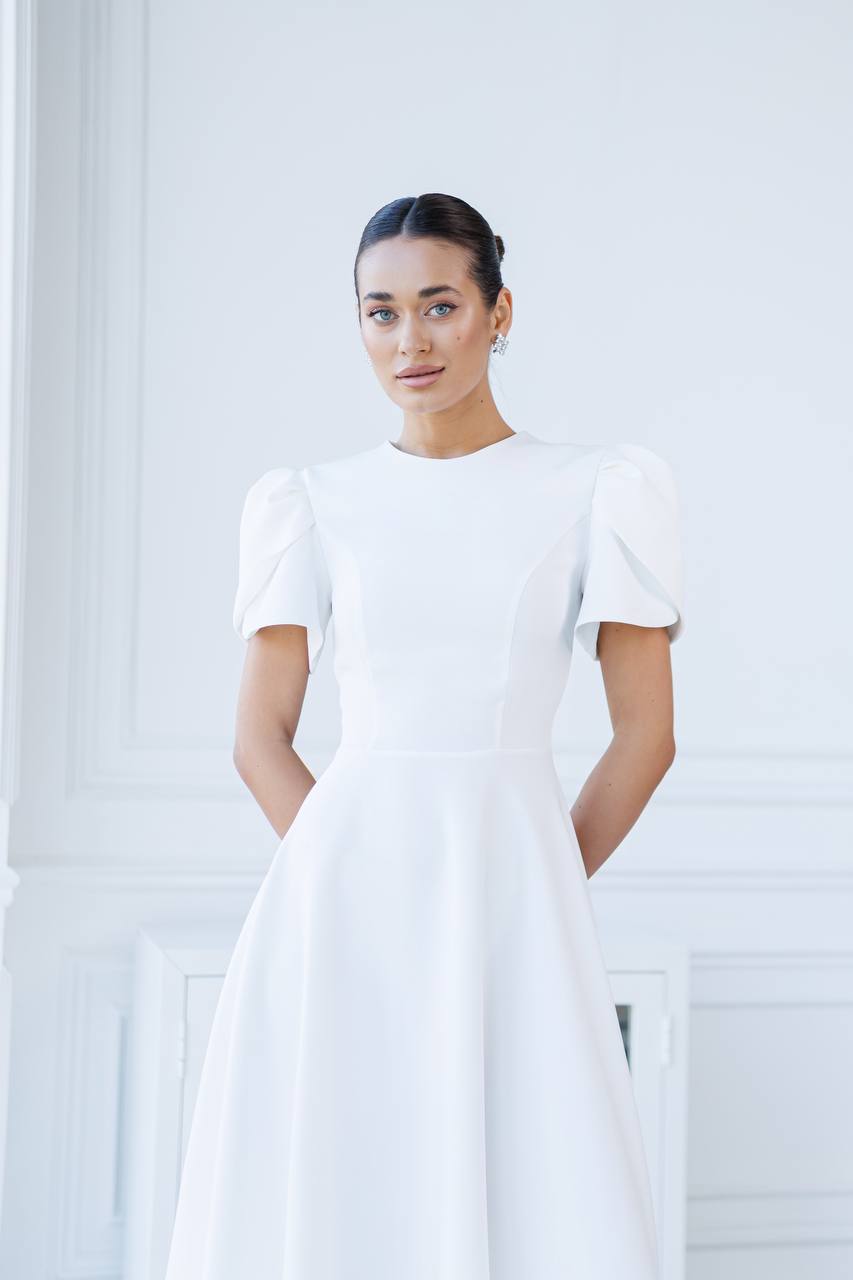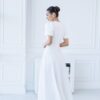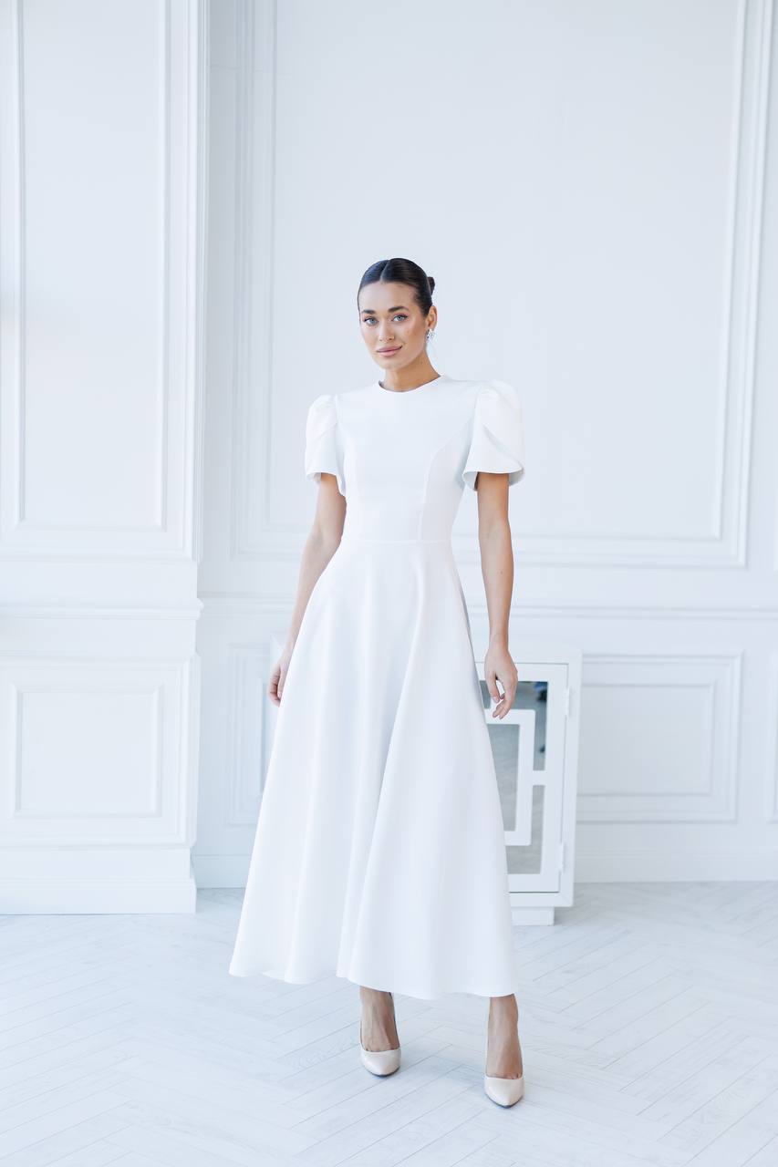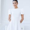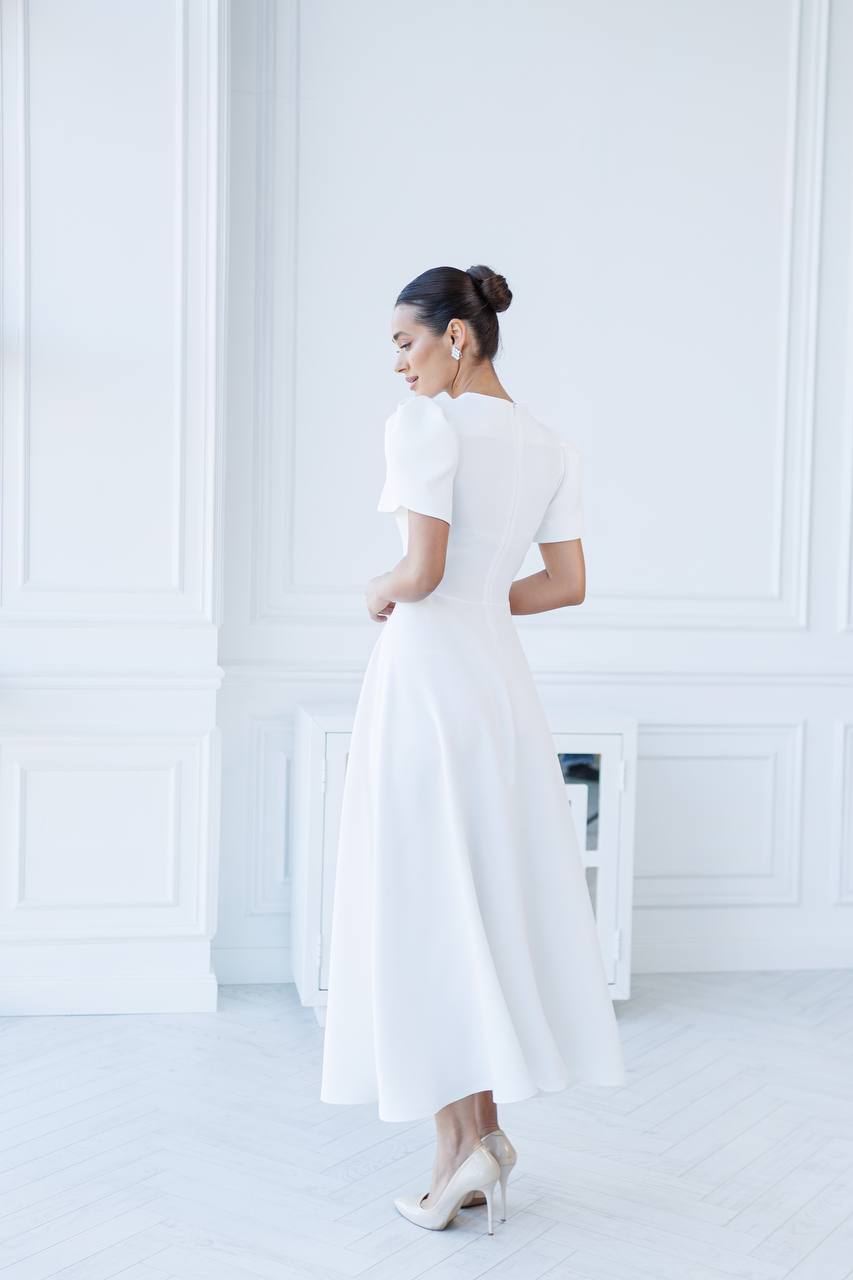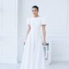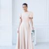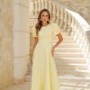 Sukienka nadaje jej świeżości i lekkości. Fason jest elegancki, z długą, swobodnie opadającą spódnicą, co sprawia, że jest idealna na różne okazje. Rękawy są zjawiskowe, z bufkami, co dodaje sukience romantycznego i stylowego wyglądu. Góra sukienki ma prosty, okrągły dekolt, co podkreśla elegancję całości. Materiał wydaje się być gładki i przyjemny w dotyku, co podnosi komfort noszenia. Sukienka ta może być doskonałym wyborem na przyjęcia, wesela czy inne wyjątkowe wydarzenia, gdzie chcesz wyglądać stylowo i kobieco. Dodatki w postaci eleganckich butów i biżuterii będą świetnie dopełniać ten look.