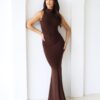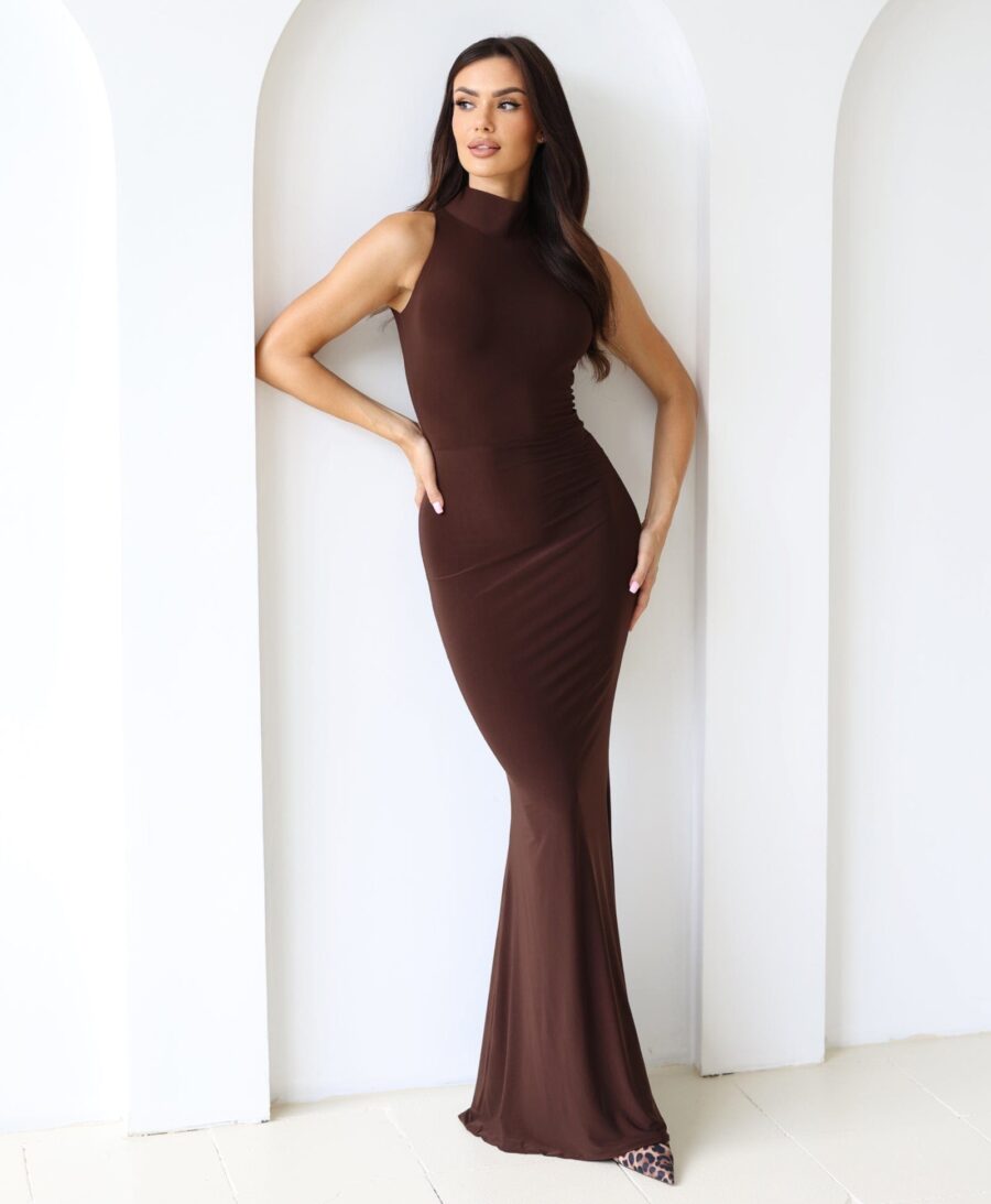 Wyjątkowy kolor, klasyczny krój i maksimum kobiecości. Zaya w odcieniu głębokiej czekolady to model, który wyróżnia się subtelną elegancją i nietuzinkową barwą. Zabudowana góra ze stójką nadaje sylwetce szlachetnego wyrazu, a syreni dół dopasowuje się do ciała, podkreślając kobiece linie i optycznie wydłużając figurę. To idealna propozycja na wieczorne wyjścia – czekoladowy kolor pięknie prezentuje się w sztucznym świetle i jest świetną alternatywą dla klasycznej czerni. Zabudowany tył zapewnia komfort noszenia i świetne dopasowanie nawet podczas intensywnego ruchu. Wybór rozmiaru – warto wiedzieć Zaya została wykonana z miękkiego i elastycznego materiału, który dobrze dopasowuje się do sylwetki. Jeśli wahasz się między rozmiarami – mniejszy może się sprawdzić, ale przy intensywnym ruchu materiał pracuje, dlatego zalecamy dobranie rozmiaru zgodnie z tabelą, aby uniknąć ryzyka pęknięcia na szwie. Detale i wykończenie Sukienka uszyta jest z podwójnej warstwy materiału – nie prześwituje, idealnie się układa i nie eksponuje wewnętrznych szwów. Tkanina jest gładka i przyjemna w dotyku, ale delikatna – warto unikać kontaktu z elementami, które mogą ją zaciągnąć, jak torebki z cekinami czy szorstkie powierzchnie.